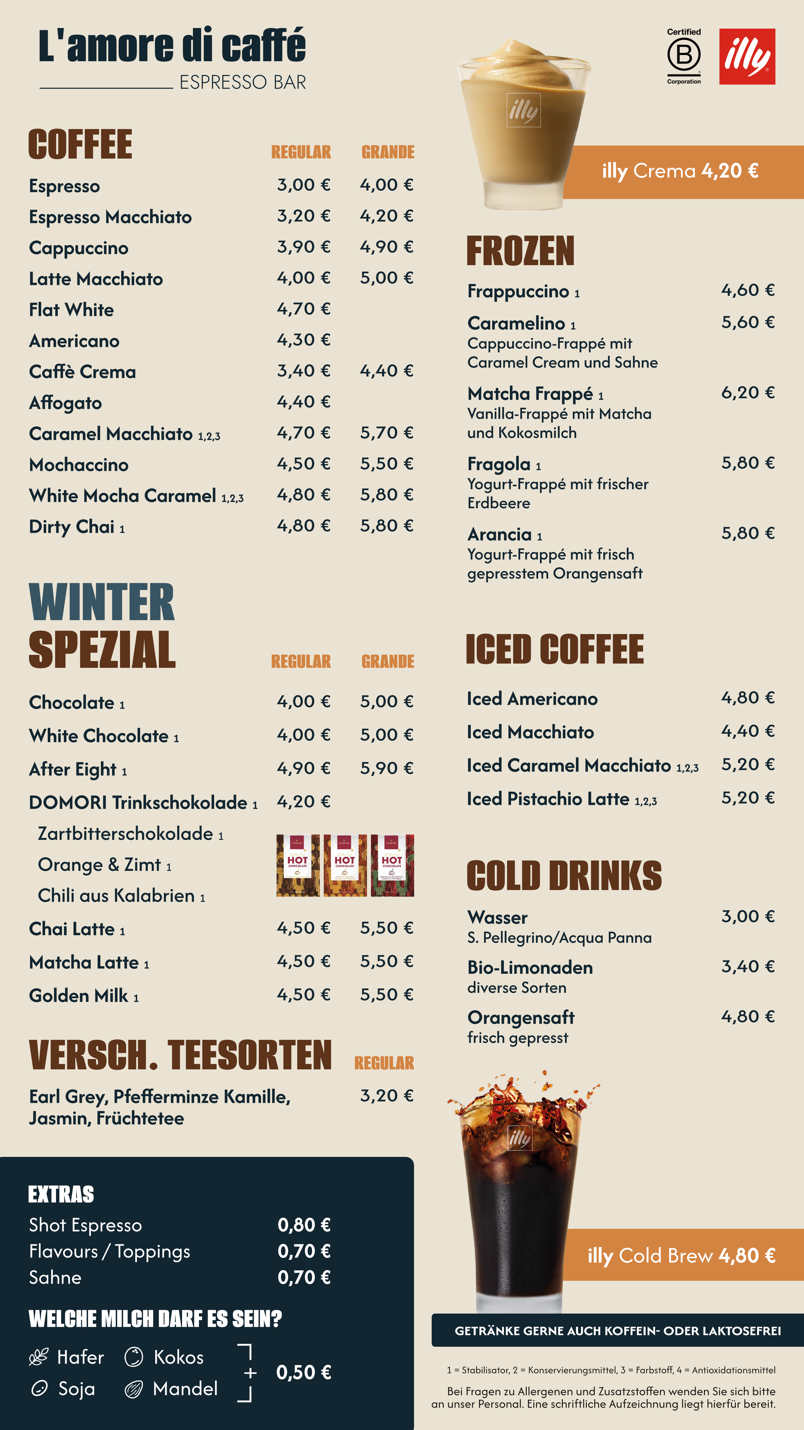 Das L’amore di caffé in Stuttgart ist mehr als nur ein Café – es ist ein Ort, an dem die Liebe zum Kaffee spürbar wird. Hier wird jede Tasse mit Sorgfalt und Leidenschaft zubereitet, um den Gästen ein unvergleichliches Geschmackserlebnis zu bieten. Unser Angebot reicht von aromatischen Espresso-Spezialitäten über cremige Cappuccinos bis hin zu einzigartigen Kreationen, die jeden Besuch zu einem besonderen Moment machen. Egal ob heiß oder kalt, jede unserer Kaffeespezialitäten wird individuell nach Ihren Wünschen zubereitet. Dazu bieten wir eine Auswahl an frischen Backwaren und herzhaften Snacks, die perfekt zu unserem Kaffee harmonieren.